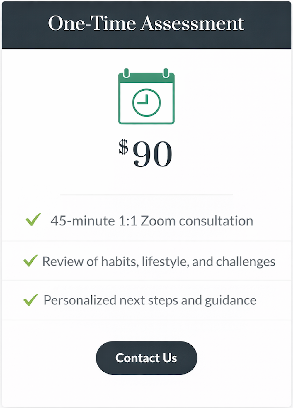 The One-Time Assessment is perfect for clients who want professional nutrition guidance without ongoing support.